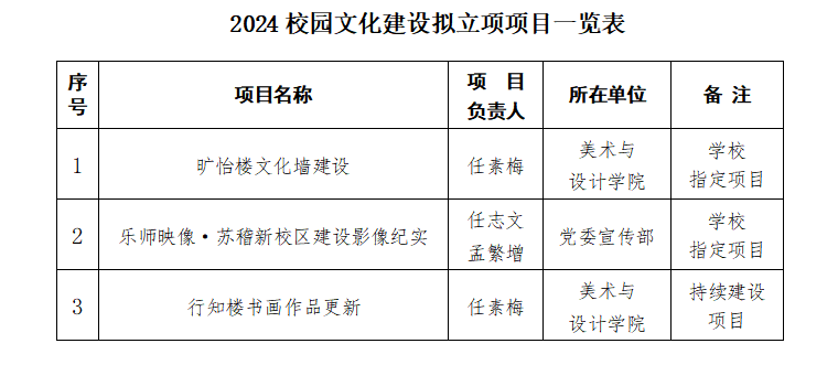 现对“旷怡楼文化墙建设”和“乐师映像·苏稽新校区建设影像纪实”等3个项目(见附件)予以公布。请各项目负责人严格按照项目建设计划,认真推进项目建设。