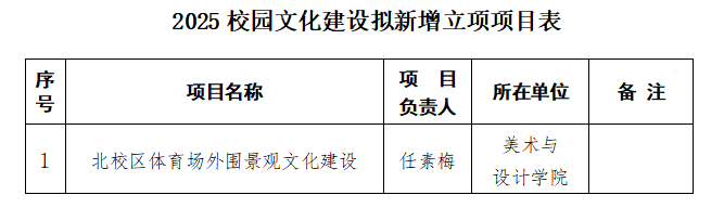 现对拟新增立项2025年校园文化建设项目予以公示,公示时间11月1日至11月8日。如有异议,请向纪委办公室、宣传部反映。
